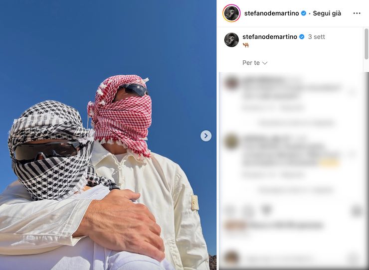 Lo showman sta infatti indossando una kefia e degli occhiali da sole per proteggersi dalla sabbia del deserto, ma non è affatto da solo. Insieme a lui c’è una persona coperta sempre con gli stessi accessori e di cui non si vede il volto. I tanti followers si sono così interrogati su chi fosse il suo compagno di viaggio e in molti hanno pensato che al suo fianco ci fosse una donna. Stefano ha infatti chiuso definitivamente la sua relazione con l’ex moglie Belen Rodriguez, e ha così voluto mantenere il riserbo sulla propria vita privata restando distante dalle luci dei riflettori.